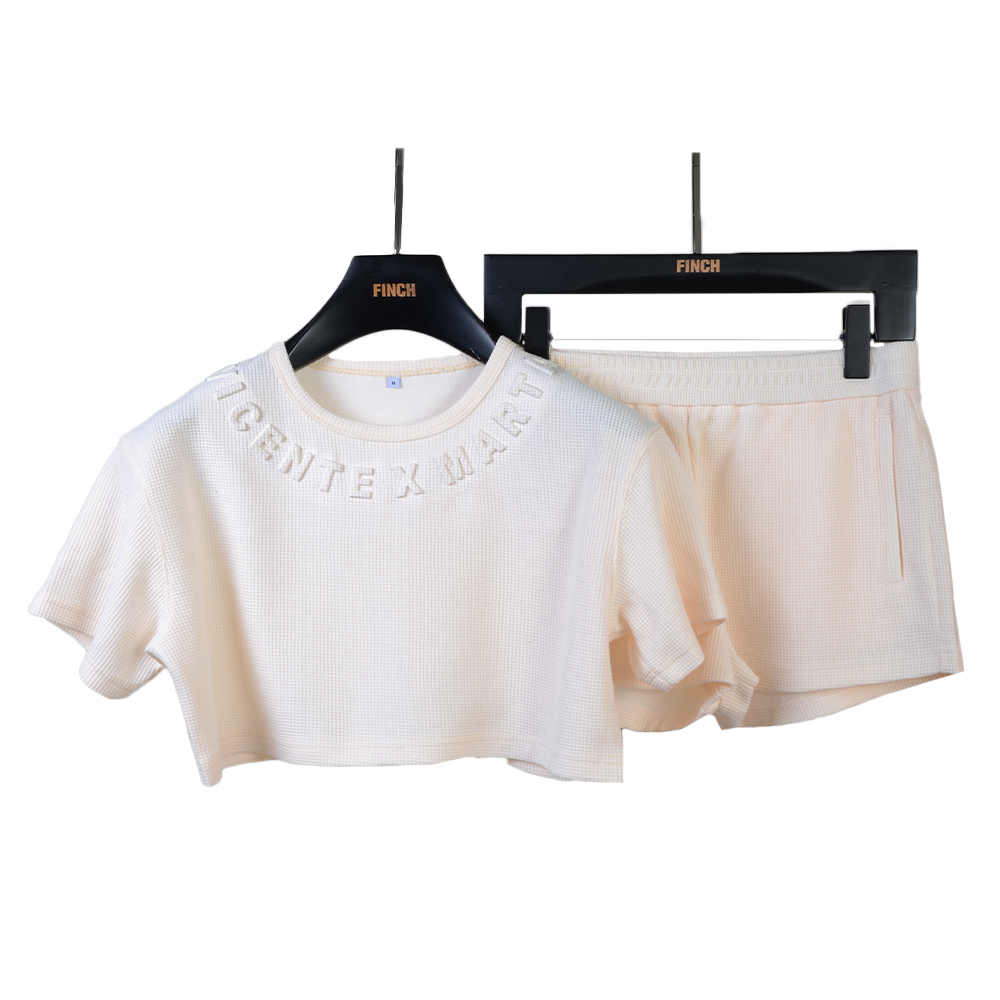 Finch Garment Women Waffle Knit Crop Top T Shirt shorts Two Piece Jogger Sports Suit Ladies Luxury Embossed Logo Sets