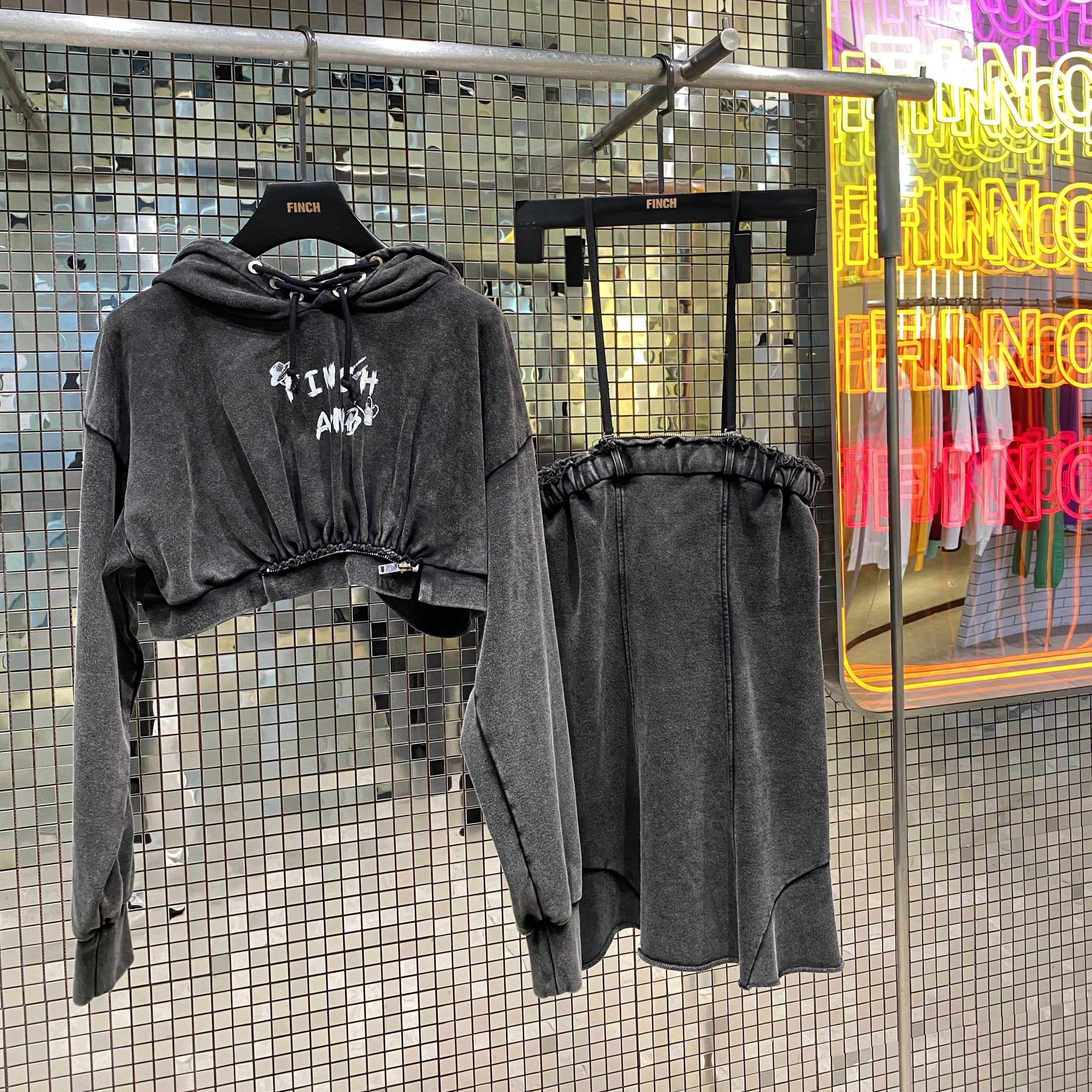Finch Garment Custom Vintage Long Sleeve Hoodie Zipper Top And Mini Skirt Sets Washed Street Wear For Women